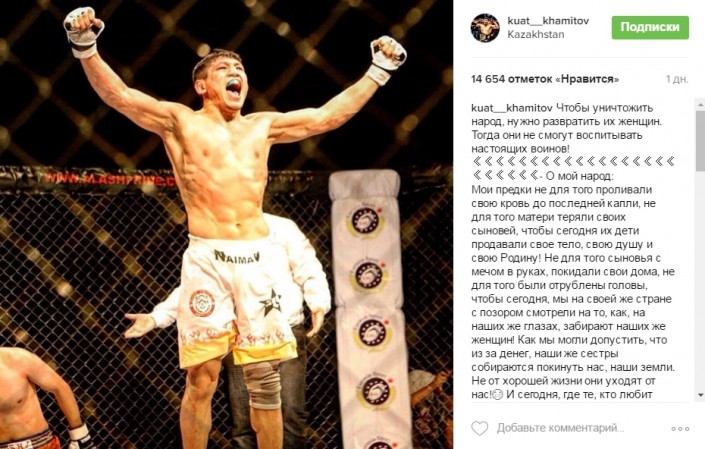 Известный казахстанский боец ММА Куат "Найман" Хамитов выступил с новым резким заявлением, на этот раз в связи с тем, что девушки-казашки выходят замуж за граждан Китая. Спортсмен задается вопросом, как мужчины в Казахстане могли допустить, что "из-за денег наши же сестры покидают наши земли". Хамитов жалеет, что не родился во времена своего предка Кабанбай батыра.
