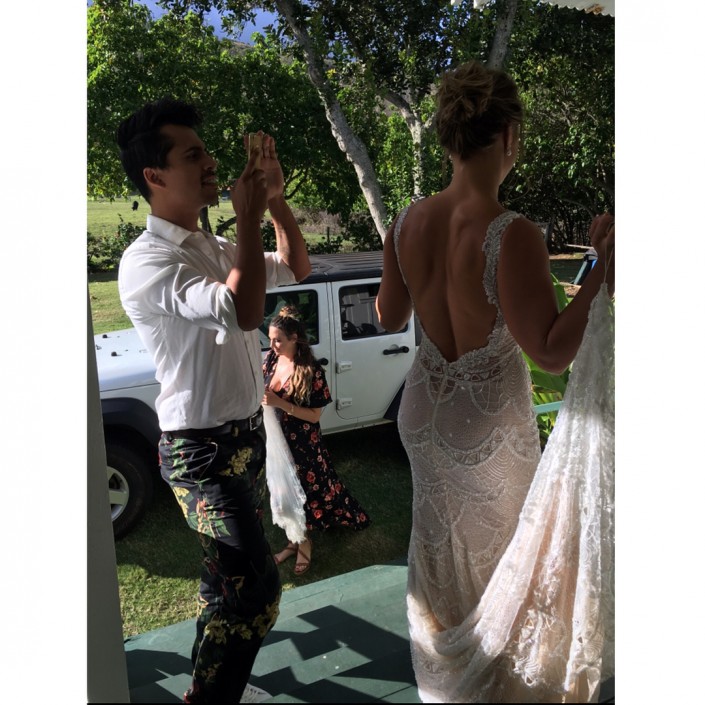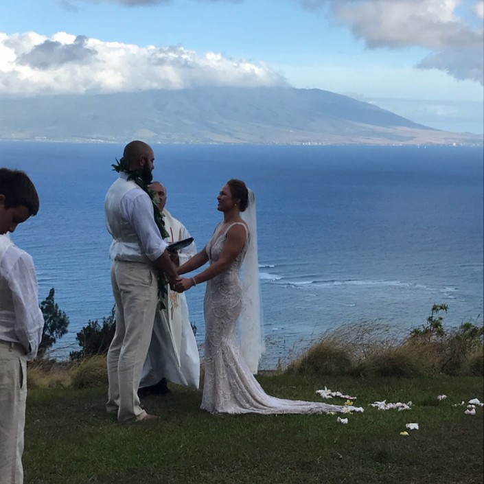 Свадьба 30-летней Ронды и 35-летнего Трэвиса состоялась на Гавайях в минувшие выходные. На невесте было белое платье с открытой спиной и кружевами от модельера Galia Lahav, а ее супруг выбрал для церемонии белую рубашку и бежевые брюки.