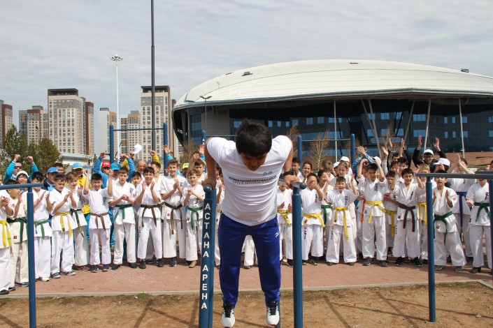 Заявка дирекции штатных национальных команд и спортивного резерва стала самой масштабной на сегодняшний день - на площадке Street Workout при стадионе "Астана Арена" собрались каратисты, самбисты, борцы, мастера тогыз кумалак и даже чирлидеры, то есть все, кто входит в национальные сборные.