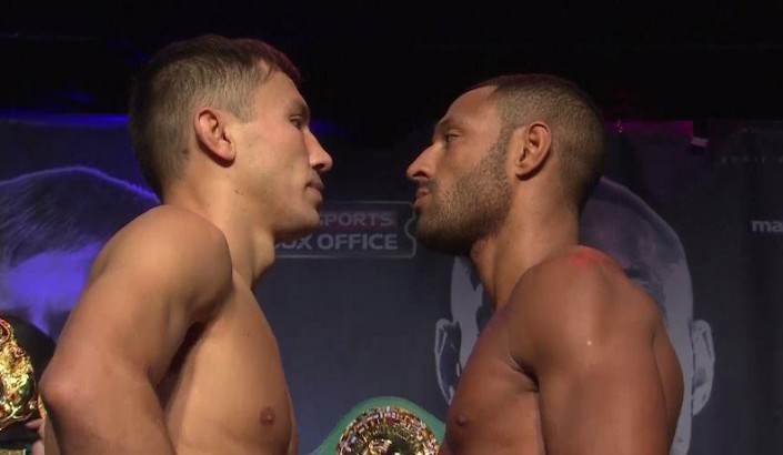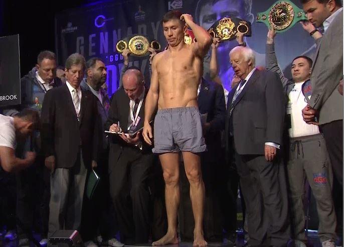 Казахстанец Геннадий Головкин оказался легче Келла Брука на взвешивании перед боем, сообщают Vesti.kz. По итогам церемонии взвешивания вес Головкина составил 158,9 фунтов (72 килограмма 158 граммов), а его оппонента, британского боксера Келла Брука, - 159,4 фунта (72 килограмма 302 грамма).