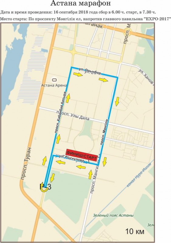 Масштабный забег стартует возле территории EXPO и затронет проспект Кабанбай батыра, улицу Орынбор, проспекты Тауелсиздик, Кошкарбаева, Жумабаева, Абылай хана, Бауыржана Момышулы и Мангилик Ел.