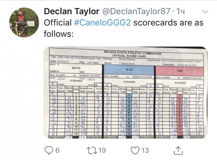 Так, Дэйв Моретти и Стив Вайсфельд отдали победу "Канело" со счетом 115-113, тогда как Глен Фельдман насчитал ничью - 114-114.