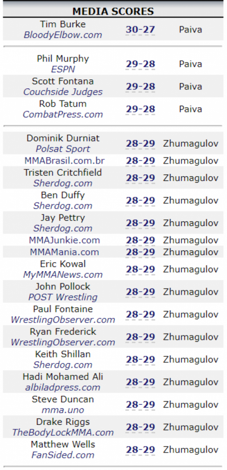 Решение судей оспорили не только казахстанцы, но и мировые эксперты. Из 20 авторитетных знатоков ММА только четверо увидели победу бразильца. А остальные 16 экспертов, в том числе представляющие авторитетный портал Sherdog.com, отдали победу казахстанцу со счетом 29:28.