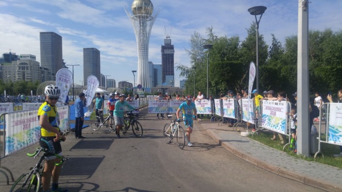 Девять часов утра, одна из главных улиц столицы возле "Байтерека" перекрыта. Через несколько минут здесь дадут старт турниру по дуатлону. Перед началом забега на разные дистанции участники разминаются и морально готовятся к началу соревнований.