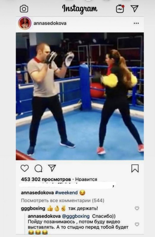 "Пойду позанимаюсь, потом буду видео выставлять. А то стыдно перед тобой будет", - ответила боксеру Седокова.