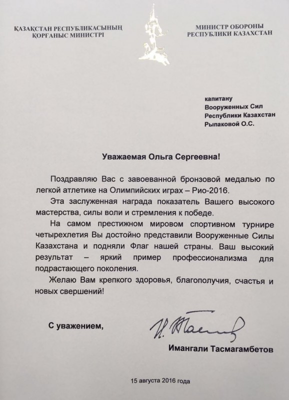 "Эта заслуженная награда - показатель вашего высокого мастерства, силы воли и стремления к победе. На самом престижном мировом спортивном турнире четырехлетия Вы достойно представили Вооруженные Силы Казахстана и подняли флаг нашей страны. Ваш высокий результат - яркий пример профессионализма для подрастающего поколения", - отмечается в поздравительной телеграмме министра обороны Казахстана.