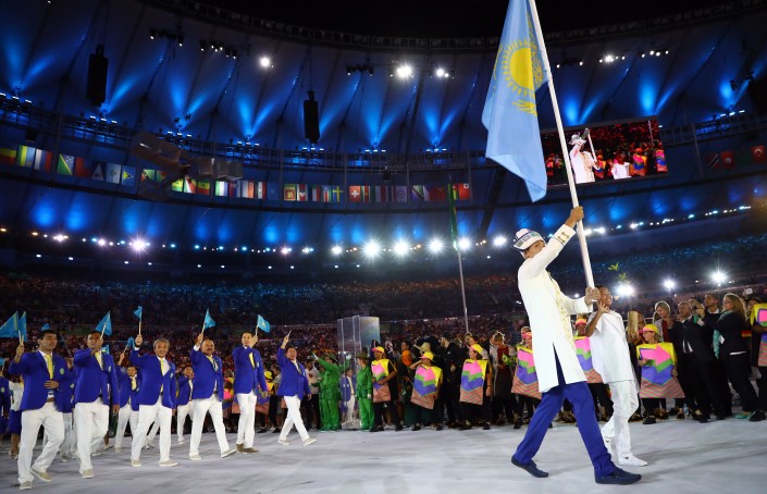 Первой вышла сборная Греции как страны, основавшей Олимпийские игры. Далее команды выходили в алфавитном порядке. Флаг Казахстана на церемонии нес таеквондист Руслан Жаппаров. Завершила парад на правах хозяев команда Бразилии.