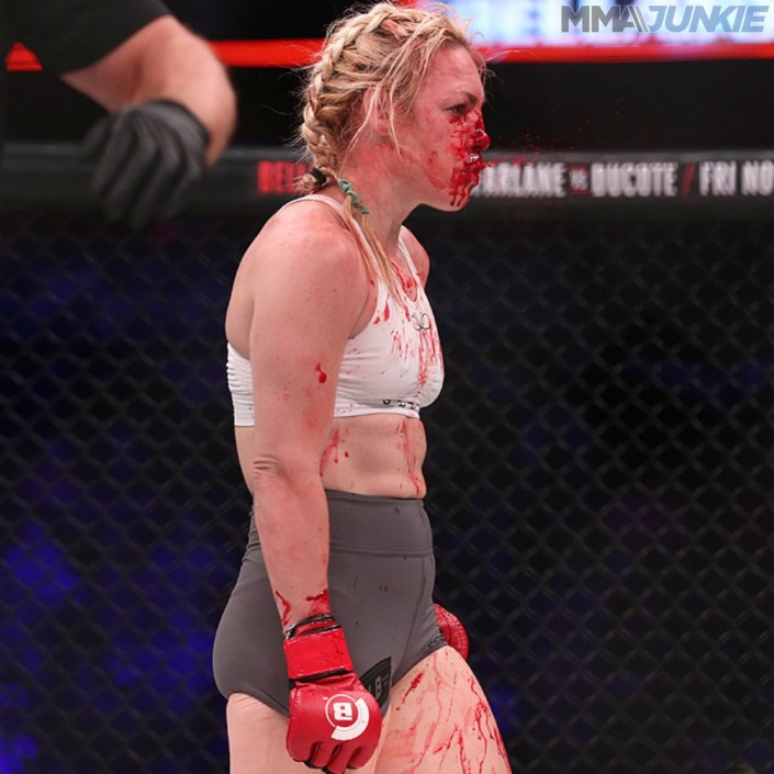"Нос Хизер Харди разнесло по всему лицу. Врачи остановили бой. Потрясающий дебют Кристины Уильямс!", - пишет MMA Today.