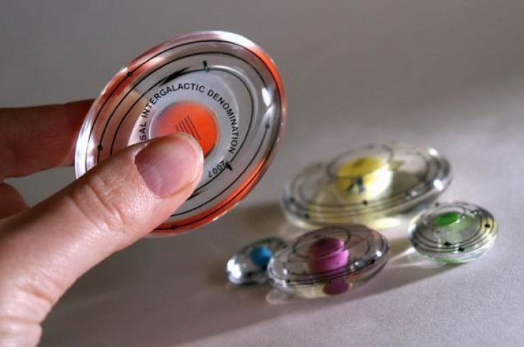 Звучит дико, но ученые Национального космического центра и университета Лестера в Англии всерьез разработали валюту Quid для будущих космических путешественников. По виду это, скорее, монета: межгалактические деньги овальные, сделаны из прозрачного полимера с цветным центром. Их не должны повредить высокие перегрузки, и сами они не смогут никого ранить. В 2007 году номинал такой монеты соответствовал 6,25 британских фунта (около 3,5 тысячи тенге).