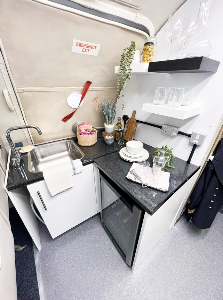 Посетители попадают в самолет по посадочному трапу, а в салоне найдут оригинальные аксессуары: кресла, подвесные шкафчики и даже симулятор полета в кабине пилота.