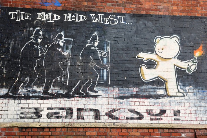 Бристоль, Великобритания. Бристоль - важный культурный центр Великобритании и родина того самого великого и загадочного Бэнкси – самого культового уличного художника современности. Благодаря таланту художника и остросоциальной тематике своих рисунков, Бэнкси быстро обрел популярность сначала в Англии, а затем и во всем мире. Самое удивительное, что он до сих пор сохраняет анонимность и скрывается от полиции. Трафаретные работы Бэнкси можно встретить по всему городу. Кстати, именно в этом городе каждый год проводится крупнейший фестиваль граффити Upfest. Жители Бристоля гордятся местными граффити и надеются, что рисунки будут сохраняться и в других городах Великобритании – в настоящее время они подлежат уничтожению, если только художник не получил предварительного разрешения на разрисовывание объекта.