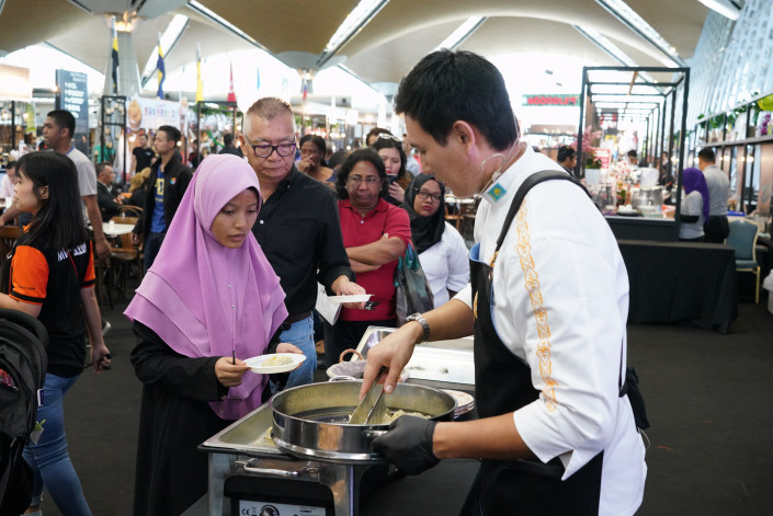 Казахскую кухню на фестивале MIGF KULinary (Malaysia International Gastronomy Festival) представила известная сеть ресторанов Parmigiano Group, которая при поддержке авиакомпании "Эйр Астана" привезла из Казахстана основные деликатесы нашей кухни: курт, жент, халву, ежегей, шубат, кумыс, казы, баурсаки… вместе с оборудованием и прочей кухонной утварью это более 600 килограммов!