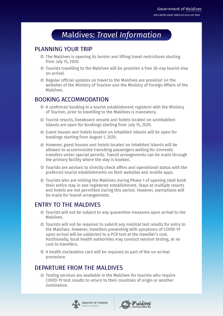 Отдых на Мальдивских островах станет возможным с 15 июля, сообщает Tengritravel.kz со ссылкой на официальный аккаунт министерства туризма Мальдив в Twitter.