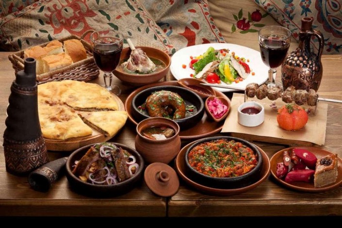 Мясо - всему голова, традиционно его готовят большими кусками - как вареная телятина, говядина или козлятина. В почете и курица, как правило, щедро сдобренная аджикой (так что любителям "попреснее" стоит сказать об этом заранее).