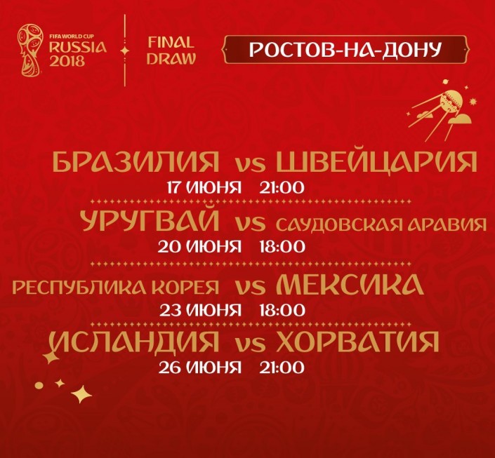 "Ростов Арена" примет четыре матча группового этапа чемпионата мира FIFA 2018. Именно здесь 17 июня начнут свой турнирный путь Бразилия и Швейцария. Также в 1/8 финала на "Ростов Арене" победитель группы G встретится с командой, занявшей второе место в группе H.