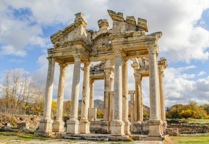 Афродисиас. Город был основан во 2 веке до нашей эры. Здесь согласно легендам, появилась рожденная из пены морской Афродита, перед ее красотой не могли устоять ни великие боги Олимпа, ни простые смертные. Сегодня Афродисиас является одним из крупнейших музеев под открытым небом. Он находится недалеко от Памуккале. Здесь можно увидеть руины стадиона, бассейн, бани, фонтаны и амфитеатр. Археологи утверждают, что на данный момент раскопано только 20 процентов всего города, остальная часть скрыта под землей.