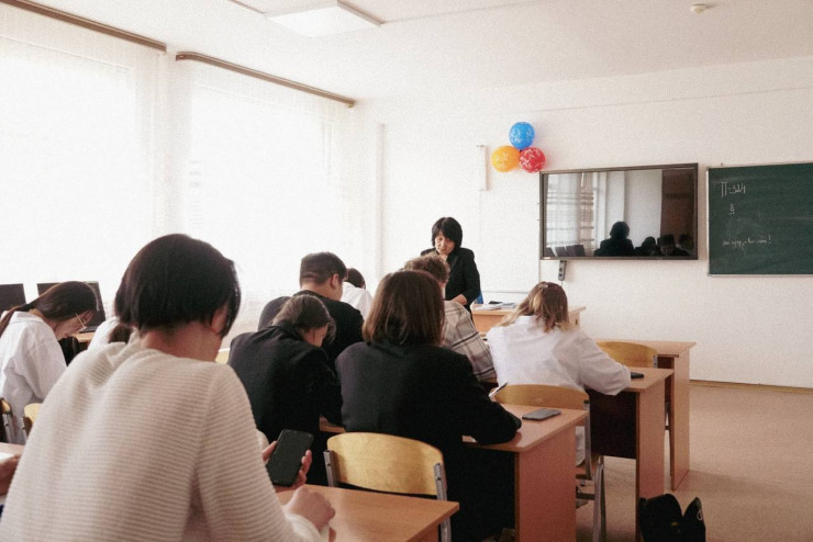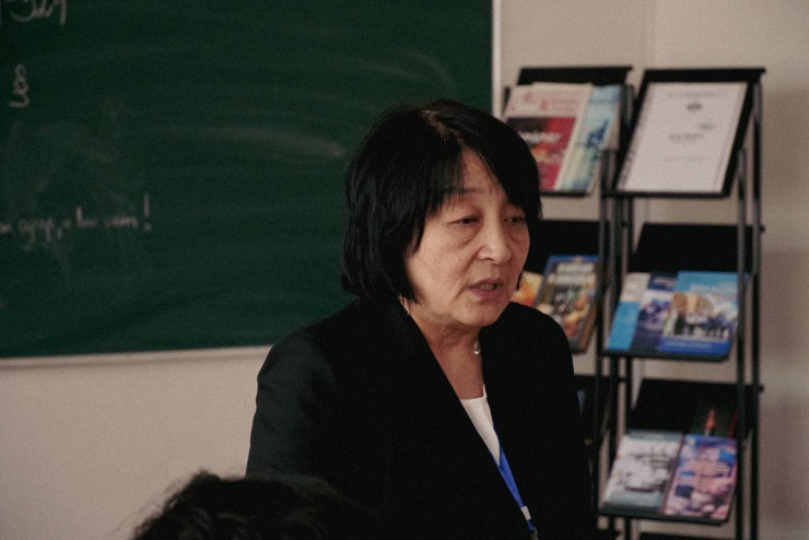 Сауле Маулыхановна ведет занятия, рассказывая студентам теоретическую часть.