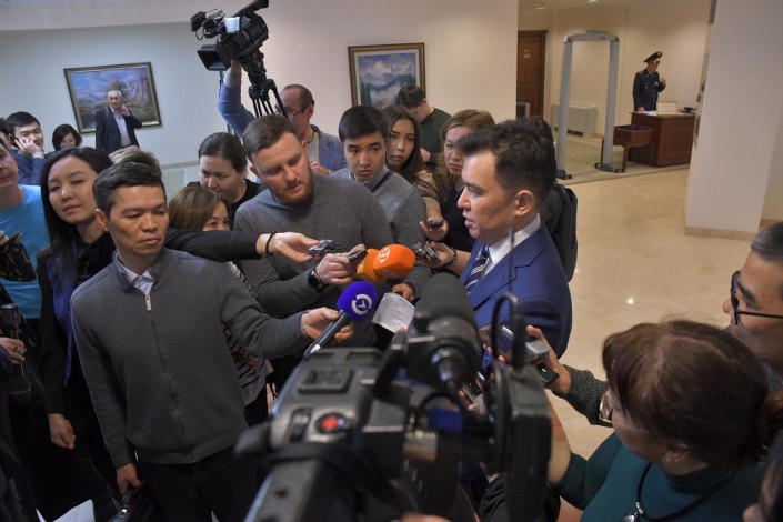 Двое из новых - глава Минобразования Куляш Шамшидинова и министр национальной экономики Руслан Даленов - попали в кольцо журналистов и теперь отвечали на их вопросы.