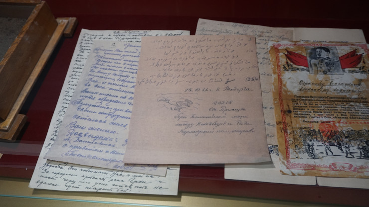 Письма, написанные в военные годы. Одно из них было написано на шрифте Тоте жазу (алфавит для казахского языка на основе арабского письма).