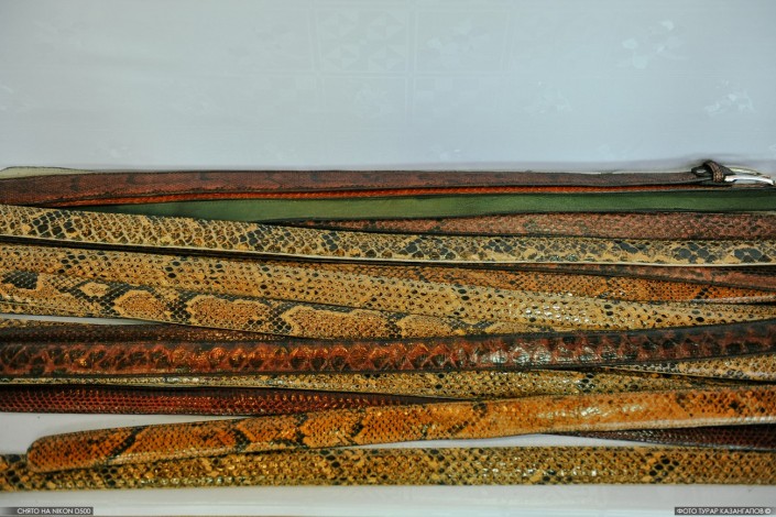 "Цены разные. Змеиная кожа - кобра, питон - десять тысяч тенге, это скидочная цена. Есть крокодил, он дороже - 20 тысяч", - рассказывают покупателям казахстанки, показывая кошельки, ремни и прочие товары.