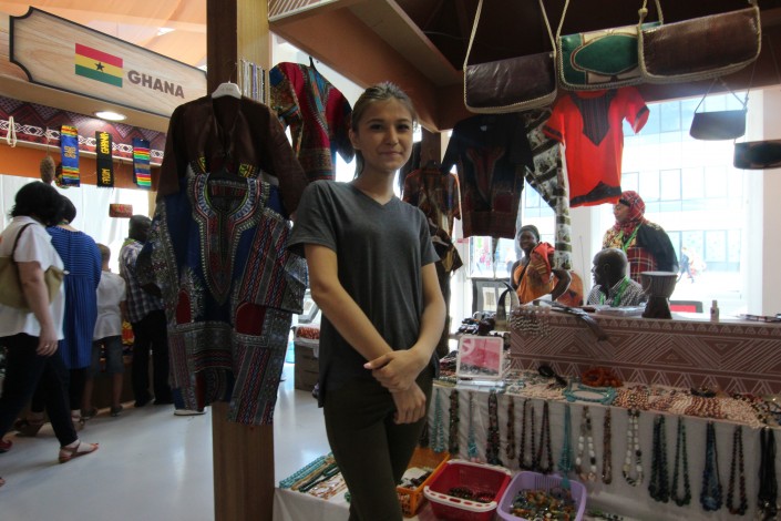 "Они очень добродушный народ и очень сильно уважают матерей. А еще они очень разносторонние. Могут не только хорошо торговать, но и хной рисовать, танцевать и петь - это очень клево", - говорит одна из казахстанских девушек, работающих в африканском павильоне.