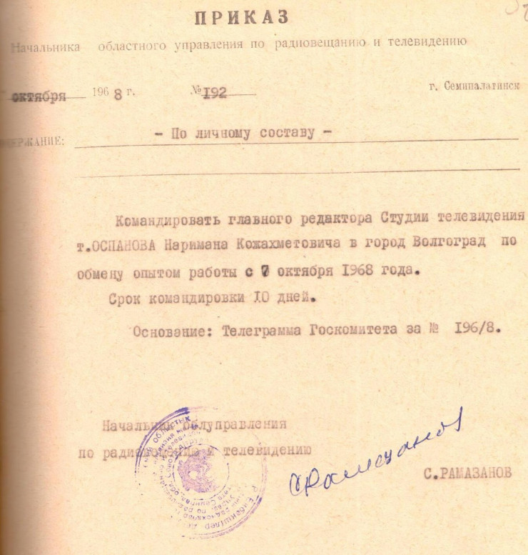 1965 год. Телевидение в Семее только появилось, а потому профессионалов этого дела тогда было немного, и, по сути, сотрудникам приходилось всему учиться самим. Бывали, конечно, случаи, когда работников отправляли набираться опыта в Москву или еще куда-нибудь.