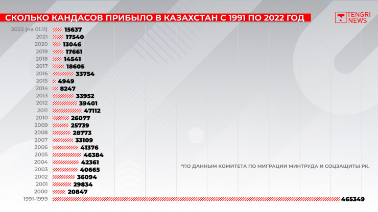 По данным Министерства труда и социальной защиты РК, по состоянию на 1 июня 5,6 тысячи этнических казахов получили статус кандаса. А уже в ноябре количество увеличилось до 15 637. И это максимальный показатель за последние 5 лет. Самый минимальный показатель по переезду кандасов на историческую родину с 2000 по 2022 годы был зафиксирован в 2015 году, когда в Казахстан прибыло 4 949 этнических казахов.