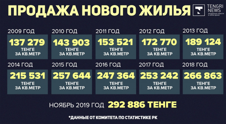 Предлагаем вспомнить, как менялись средние цены на жилье в новостройках с 2009 по 2019 годы. По данным Комитета по статистике МНЭ РК, средняя стоимость жилья на первичном рынке в 2009 году была 137 279 тенге, в ноябре 2019-го сумма достигла 292 886 тенге за квадратный метр.