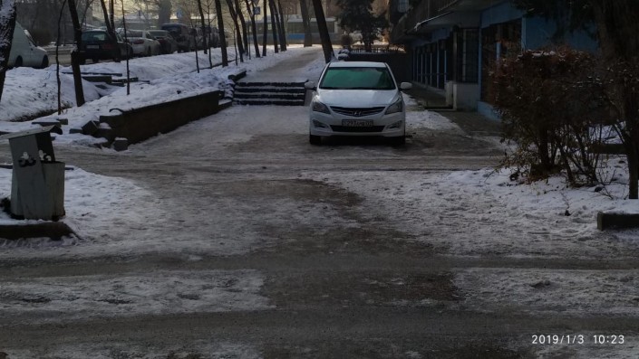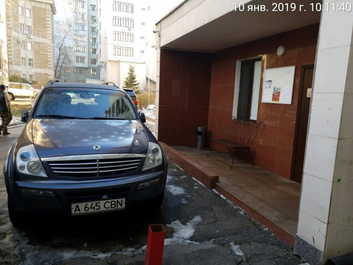 Житель дома № 116 по проспекту Достык 10 января пожаловался на водителя SsangYong. Автор видео заявляет, что автомашину постоянно оставляют у входа перед подъездом № 4.