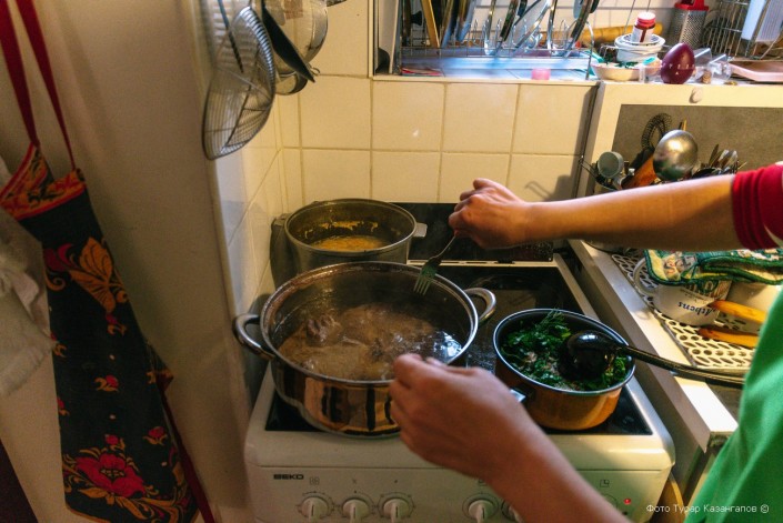 На кухне вовсю идут приготовления. На обед будет бешбармак.
