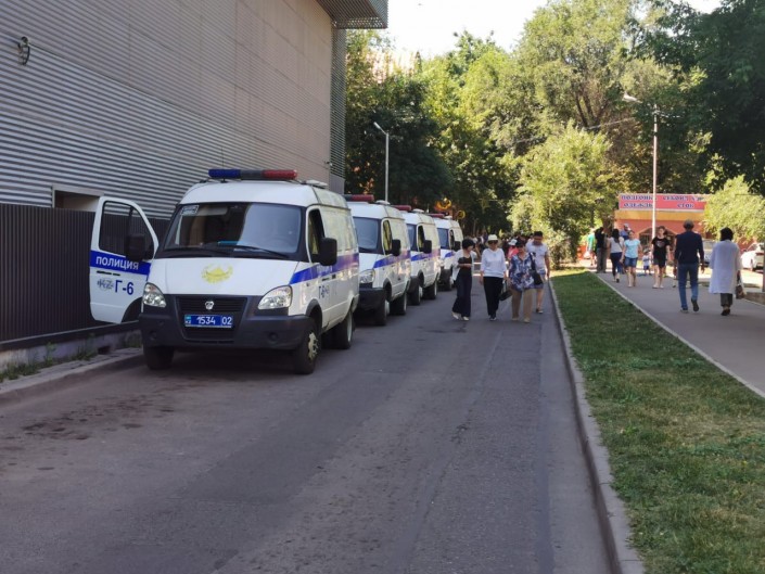 Тізіліп тұрған қызметтік көліктер. Есіктері ашық. Бірақ жүргізушісі де, полиция жасағы да көрінбейді. Көзден таса жерде сапқа тізіліп, дайындық жұмыстарын жүргізіп жатыр ма екен деген ой туды. Иә, бірінші кезекте митингіге келген полицейлер екенін ұқтыңыз.