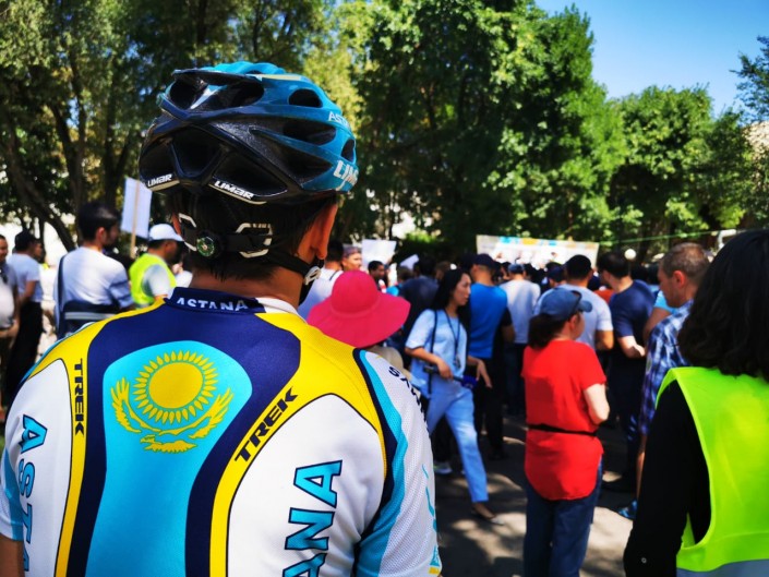 "Астана" велокомандасының спорттық киімін киіп келген (расында өтіп бара жатып, қосылған да болуы мүмкін) мына спортшының топқа қосылмай, жырақтан ғана байқап, мінберге шыққандарды мұқият тыңдап тұрған сәтінен түстік. Оның бұл шараға арнайы келген-келмегеніне болжам жасамай-ақ қоялық. Қайткен күннің өзінде жиналған халық қарасын көбейткендердің ішінде кездейсоқ жүргендер болды.