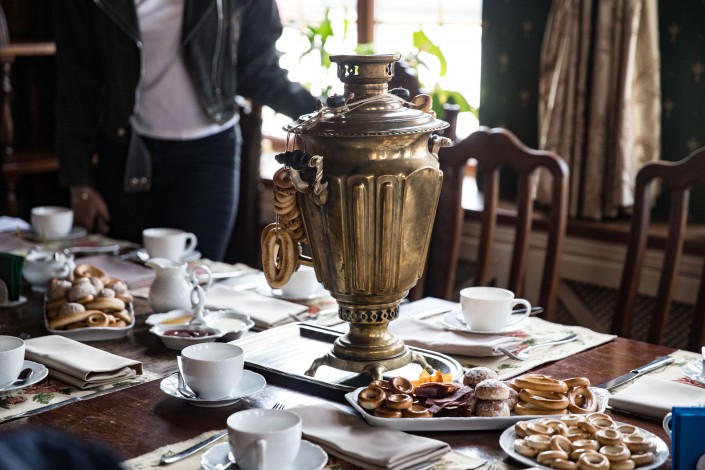 Чтобы дать отдохнуть уставшим гостям, их приглашают на чаепитие с самоваром в ресторан русской кухни на пересечении Казыбек би - Кунаева. Известно, что этот особняк принадлежал семье купца Федорова. Обстановка в доме не аутентична, интерьер создан современными дизайнерами. Но этот пит-стоп позволяет окончательно погрузиться в атмосферу того времени.
