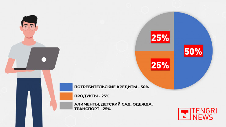 Семья Сабита расходует 50 процентов бюджета на погашение потребительских кредитов, на продукты - 25 процентов, на алименты, детский сад, одежду и транспорт - 25 процентов.