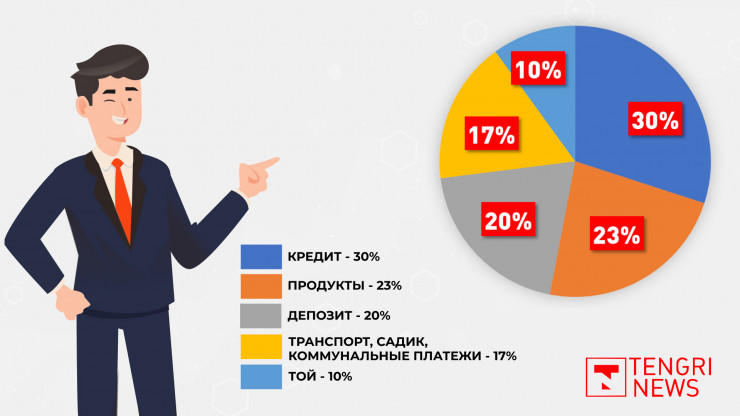 Семья Марата тратит на погашение кредитов 30 процентов от общего бюджета, на продукты питания - 23 процента, транспорт, садик, коммунальные платежи обходятся в 17 процентов, на тои расходуют 10 процентов, 20 процентов откладывают на депозит.