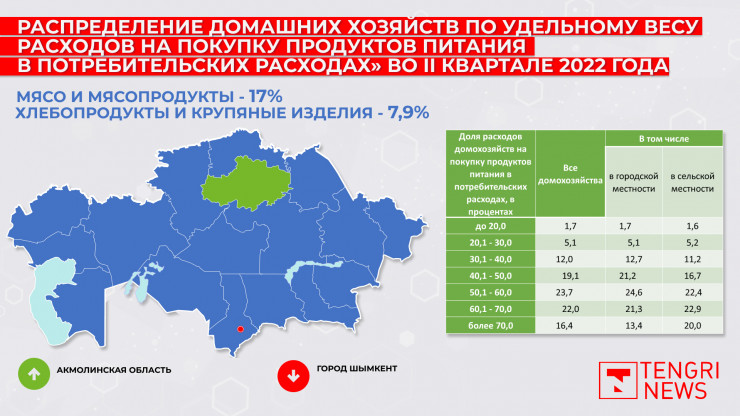При этом большую часть денег население также тратит на покупку мяса, хлебных и крупяных изделий. Самый высокий уровень потребления мяса и мясопродуктов отмечается в Акмолинской области, самый низкий – в Шымкенте.