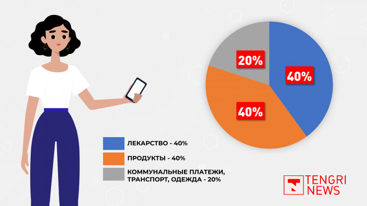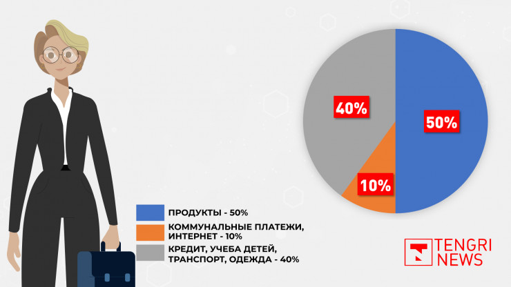 Семья Марьям тратит из семейного бюджета на продукты питания 50 процентов, на погашение кредита, учебу детей и транспортные расходы - 40 процентов, коммунальные платежи и интернет - 10 процентов.