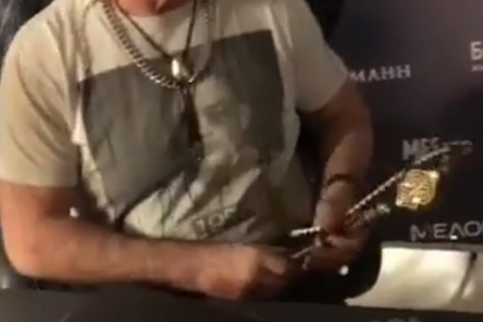 На этот раз обошлось без чапана (все помним грустного Николаса Кейджа в образе казахского джигита), но зато один из поклонников подарил Линдеманну камчу. Фронтмен Rammstein тут же опробовал презент, взмахнув ей в воздухе, после чего передал людям из своего окружения. Пригодится.