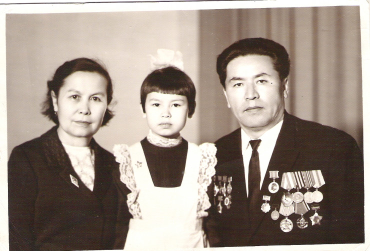 Солдан оңға қарай: Рахила Қошқарбаева, Әлия Қошқарбаева және Рахымжан Қошқарбаев