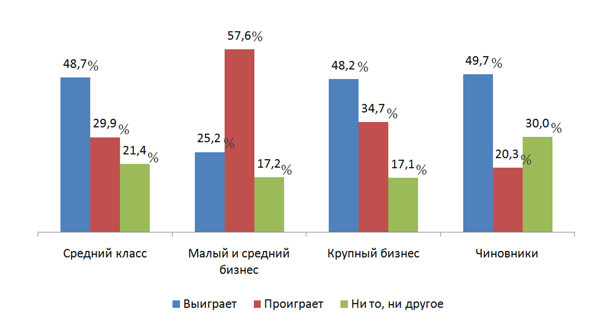 Как видим, в глазах респондентов единственной явно проигравшей стороной является малый и средний бизнес.