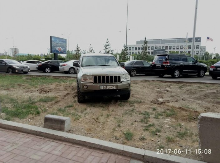 Водитель Jeep оставил свой внедорожник на газоне на углу улицы Кошкарбаева и проспекта Тауелсыздык.