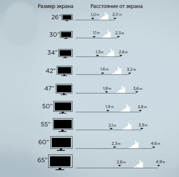 - Минимально безопасное для зрения расстояние от экрана - 3,5 метра. Это при стандартной диагонали 82 единицы. Если телевизор больше, то и расстояние больше. Тогда минимизируется электромагнитное воздействие от экрана на весь организм, глаза не так устают и профилактируется близорукость. Но если возле любого телевизора сесть на расстоянии метра, то глаза, соответственно, будут перенапрягаться и уставать.