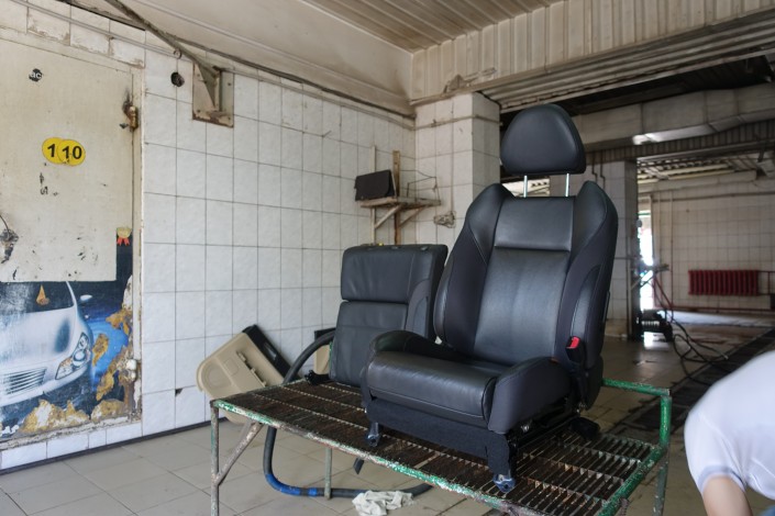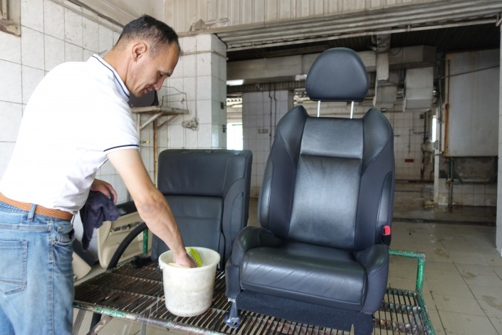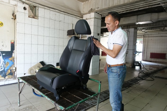 Исатай по прежнему работает на автомойке. Мы застали его за чисткой автомобильных кресел.