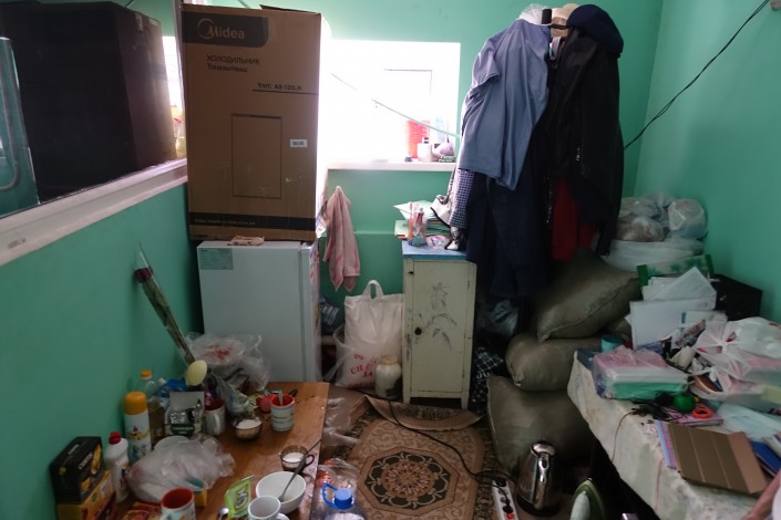В углу маленькой комнаты стоит новый холодильник, который пожертвовал кто-то из добрых людей.