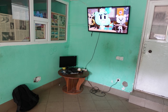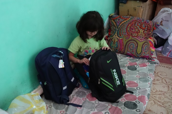 Пока посетителей в автомойке нет, дочь Исатая Инабат смотрит мультики и параллельно разглядывает акварельные краски и тетради, которые ей и ее старшему брату к началу учебного года привезли неравнодушные люди.