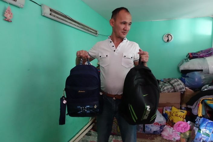 Мужчина демонстрирует новые рюкзаки, которые также его детям принесли в подарок.
