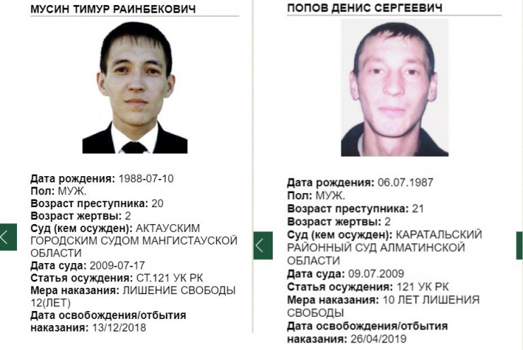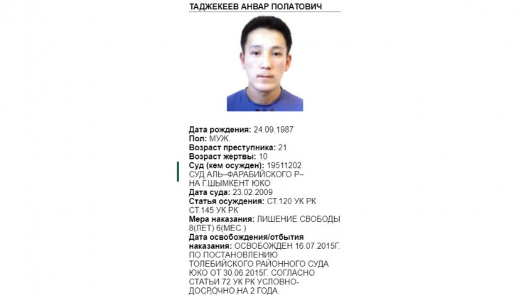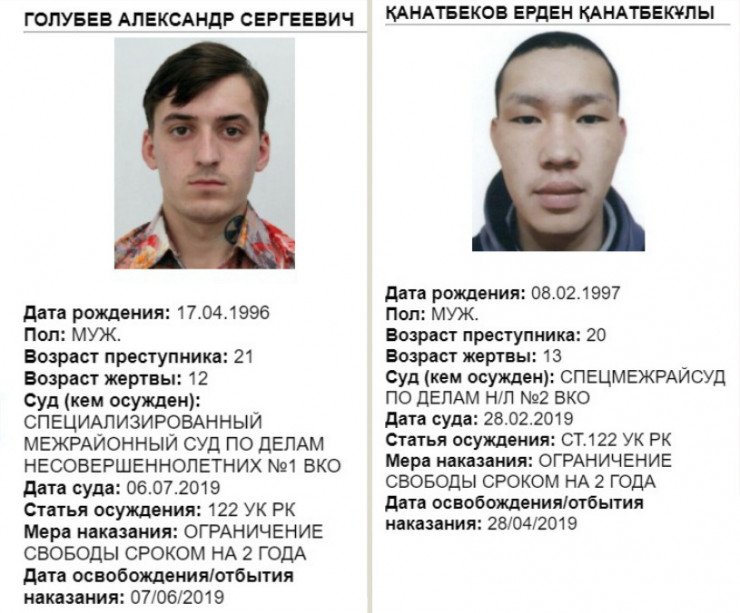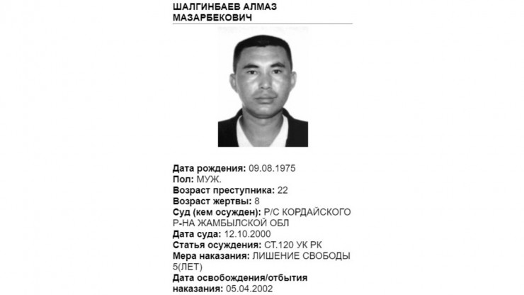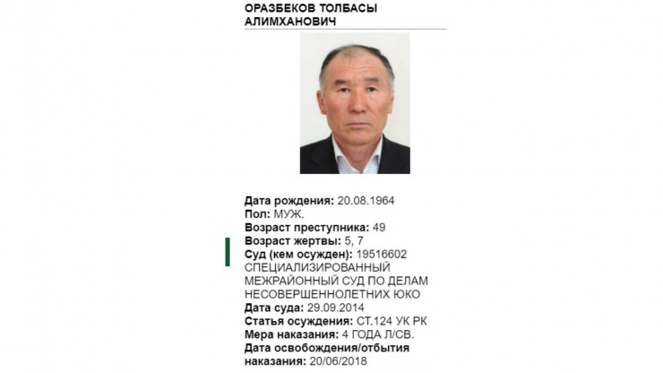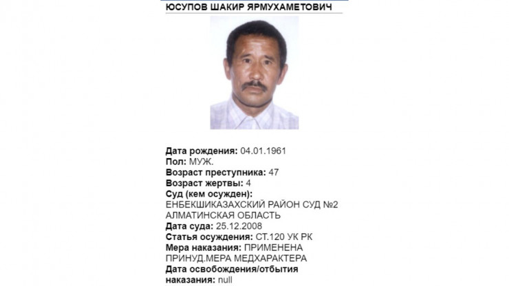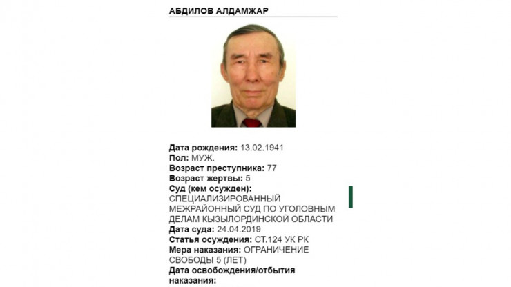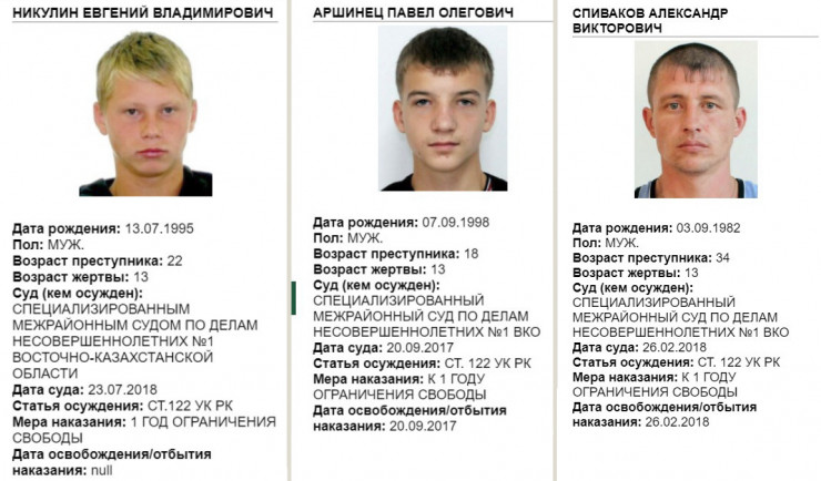 Также у Комитета по правовой статистике есть специальная карта лиц, привлеченных к уголовной ответственности за совершение преступлений против половой неприкосновенности несовершеннолетних. Здесь опубликована информация о 207 осужденных по статьям 120-124 УК РК. Отображены личные данные, возраст жертвы, статья осуждения и мера наказания.