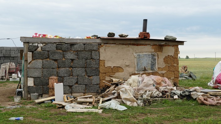 Поэтому до наступления холодов Каратай хочет во что бы то ни было достроить первый этаж дома и заселить туда семью. При этом работы он будет продолжать и зимой.