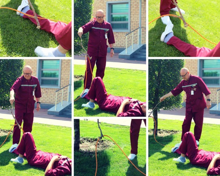 Как только мы оказались рядом с пострадавшим, необходимо устранить источник поражения, но не голыми руками, а тем самым предметом, который не проводит ток. Нам посчастливилось найти поблизости ветку.