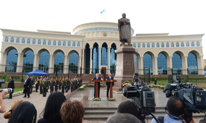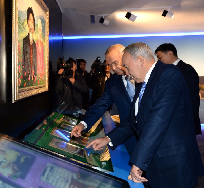 Президент Казахстана Нурсултан Назарбаев и президент Узбекистана Ислам Каримов принимают участие в церемонии открытия нового здания посольства Казахстана и памятника Абаю. 2013 год. Фото с сайта akorda.kz